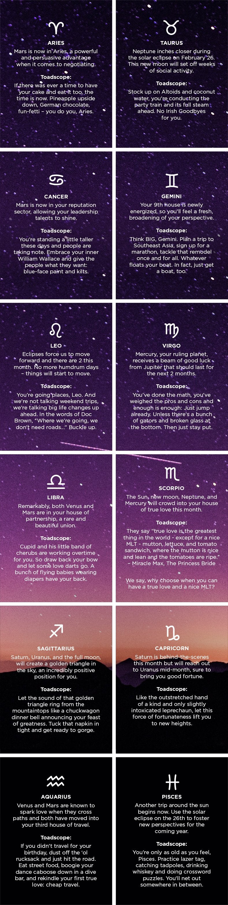 Believe it or not, we've got a cure for what ails ya. As our Toadiac (see what we did there?) continues, take our February/March predictions and use them to your advantage. It's written in the stars, after all. Every month we'll be offering up our Toadscopes to cut through the cosmic fluff and deliver your destiny. Crystals and tea leaves sold separately.