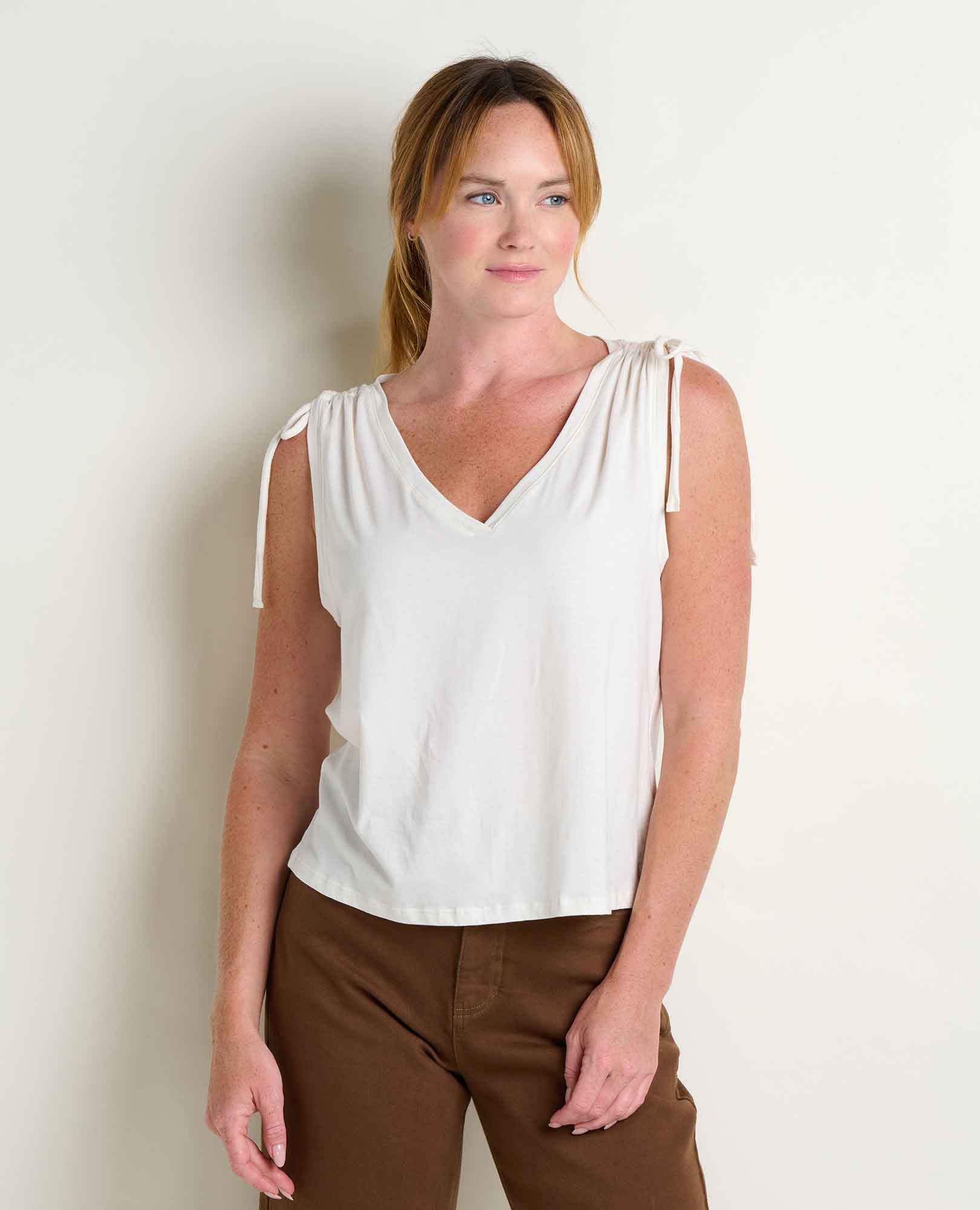 All the comfort and ease of our favorite t-shirt with a few sweet, fit-enhancing details. We love this lightweight top’s flattering straight hem and cinchable shoulder ties to switch from muscle tee to tank.