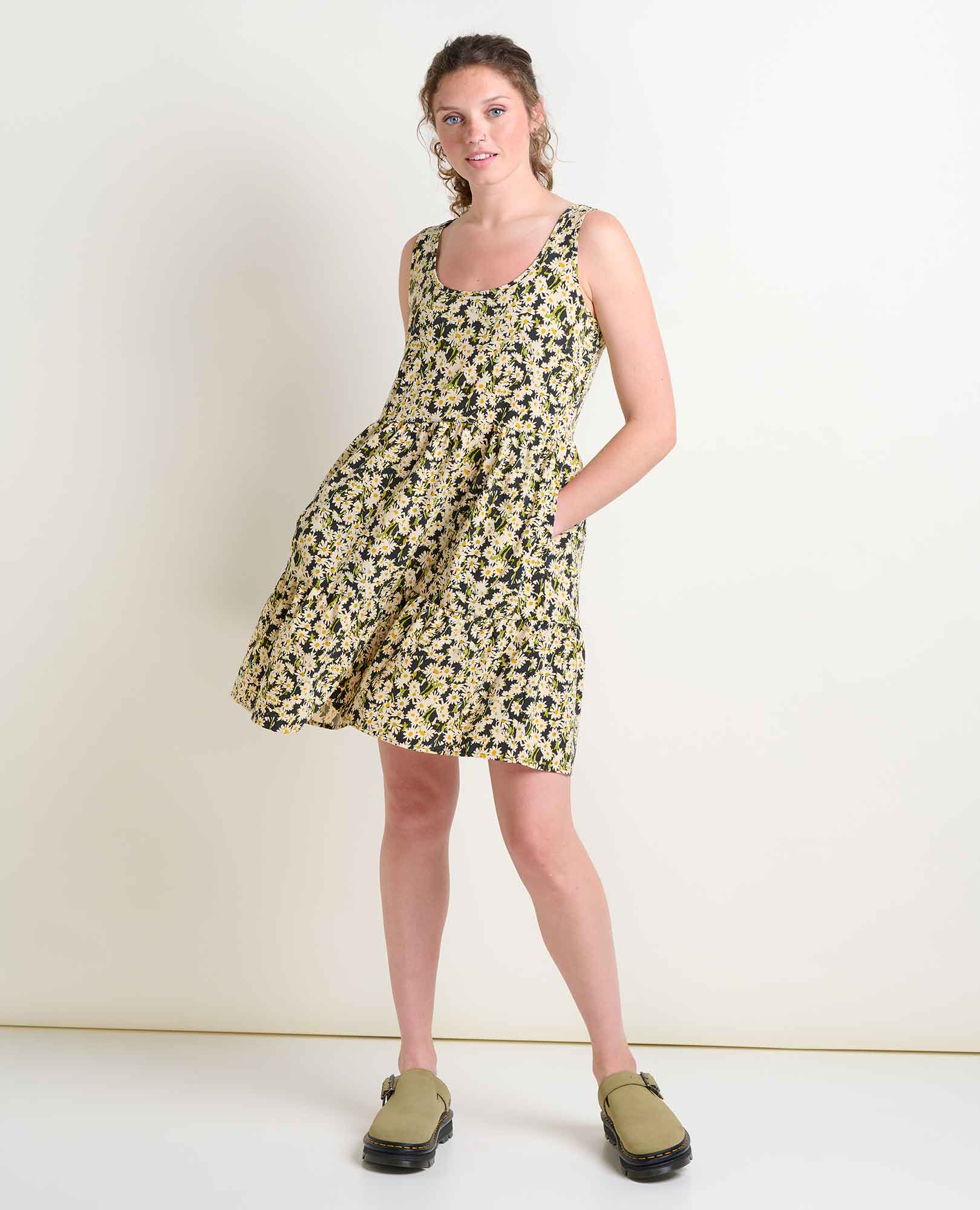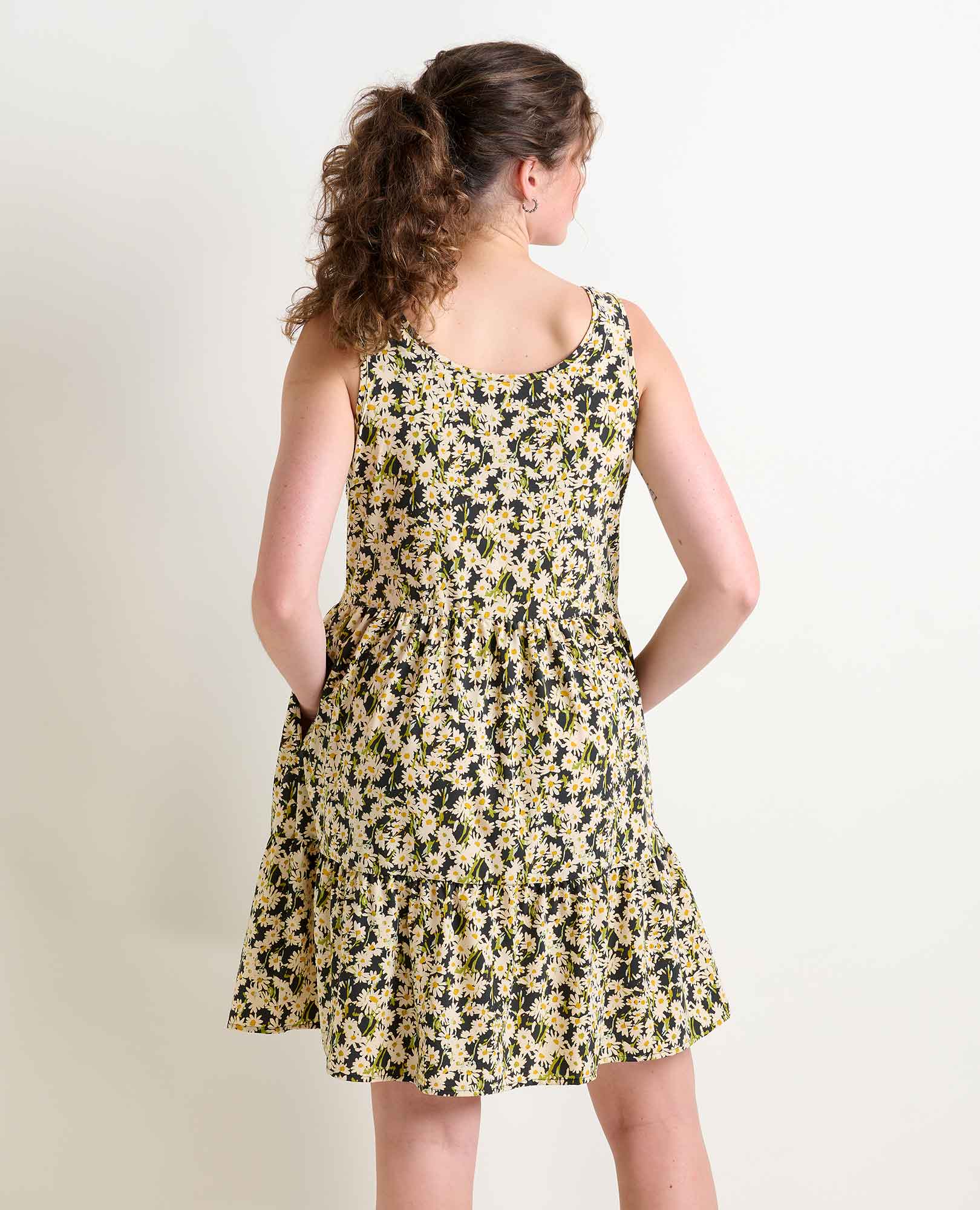 Fit: Swing silhouette, scoop neck, bra-friendly straps, tiered skirt, hits above the knee, 36.5 inch length